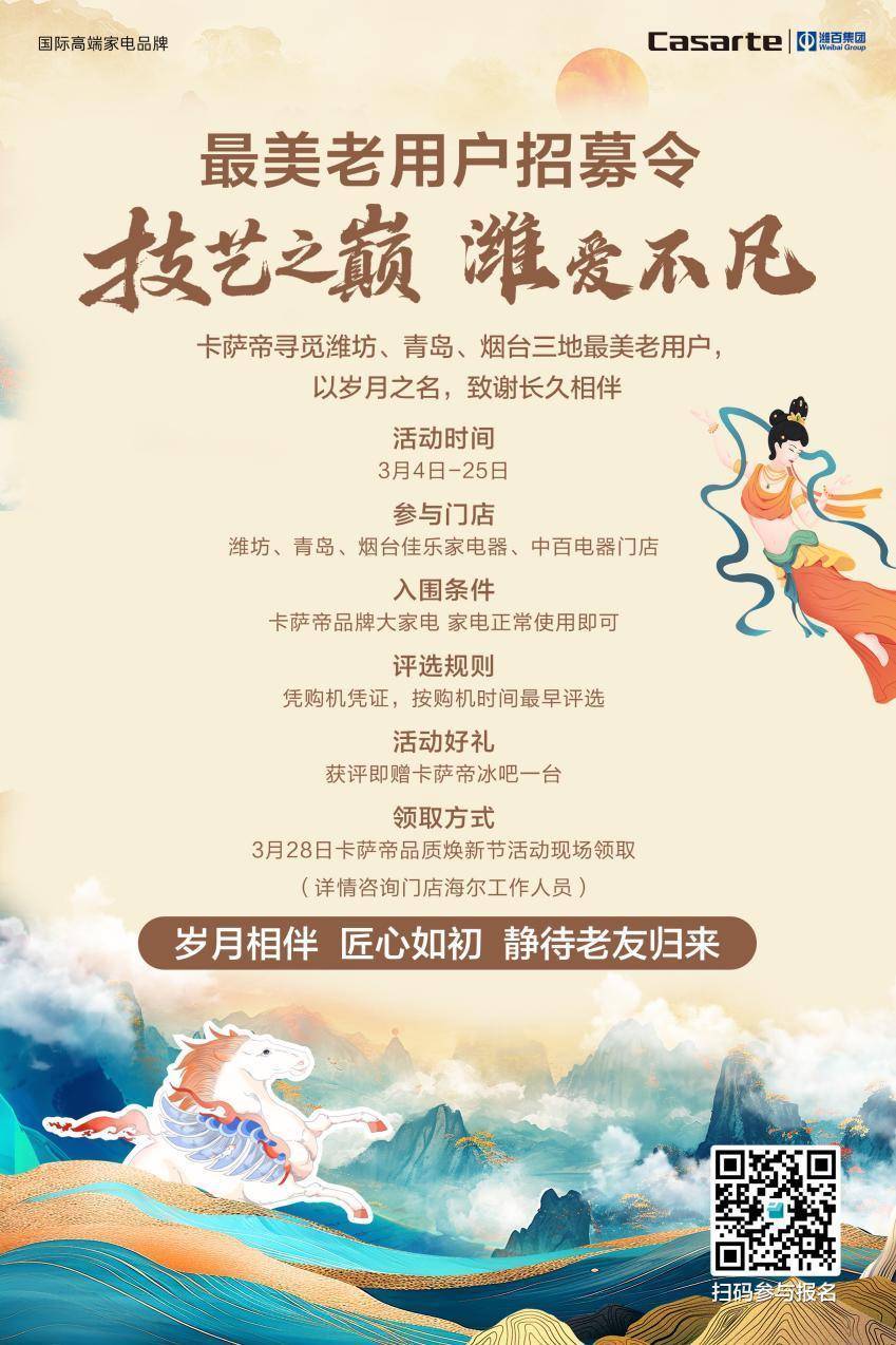 春意渐浓,千年非遗匠心将相逢前沿科技奢睿。3月28日,潍百集团联袂海外高端家电品牌卡萨帝,将于潍百集团益家园家电家居Mall(谷德锦店)中庭,重磅开启“本事之巅 潍爱超卓”非遗看守之旅暨品性焕新节,为鸢齐市民呈现一场集文化、科技、福利于一体的品性嘉会。
