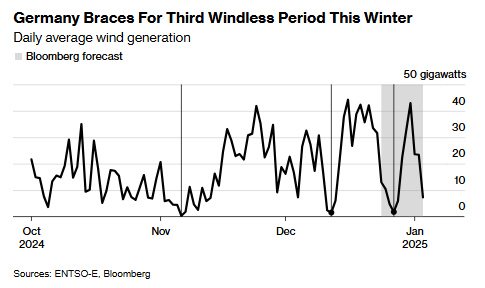 12月27日,展望德国风力发电量将降至1.8 GW,仅为本年冬季迄今平均水平的10%。跟着风力发电的萎缩,德国电价在早些时辰飙升,达到了自2022年动力危急以来的最高水平。但同期,与此前的预期比较,展望气温将高于30年的泛泛水平,并对12月27日的气温进行了进一步上调。