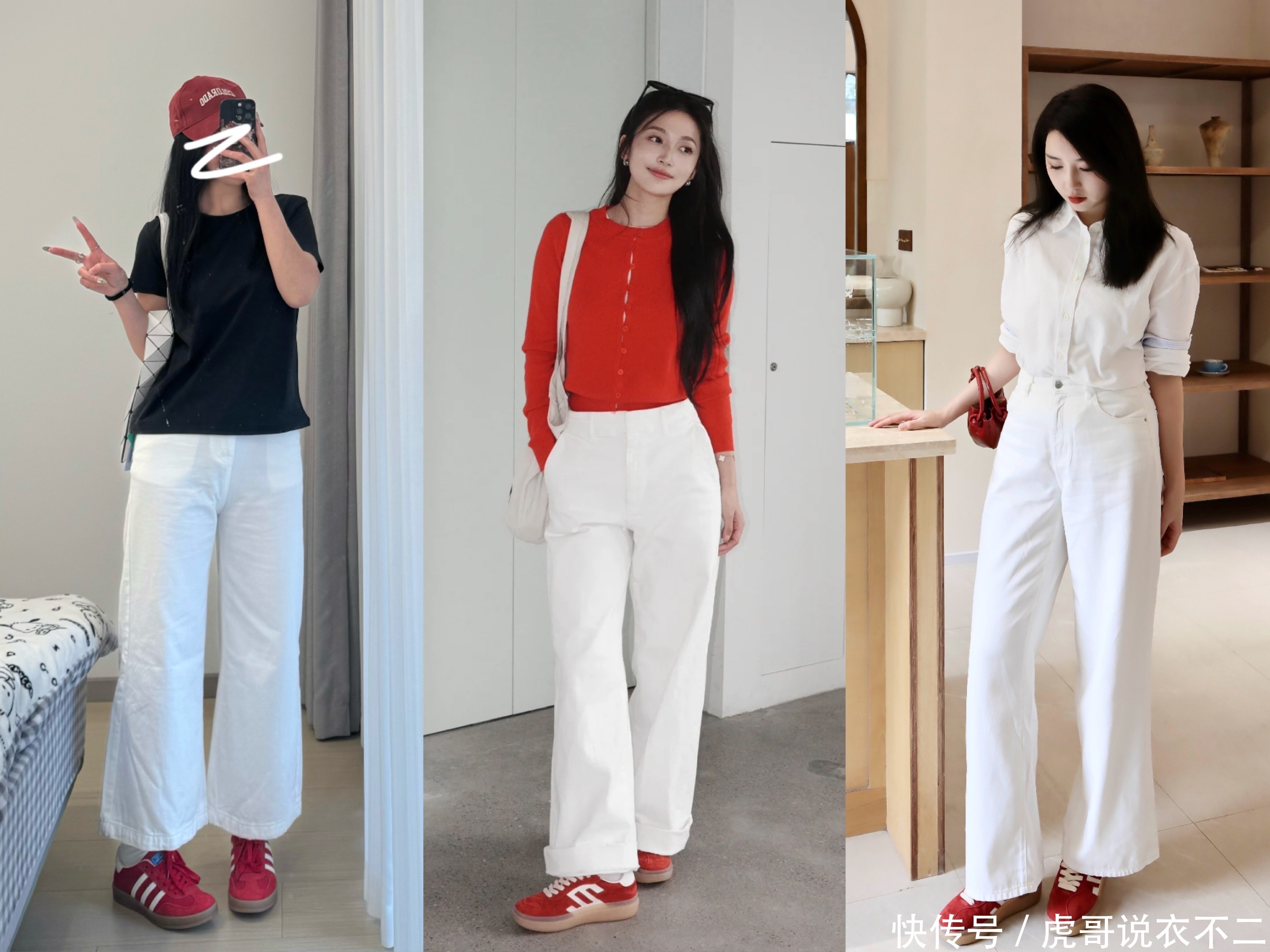 白色阔腿裤的崭新与红色德训鞋的复旧相献媚,创造出了一种既当代又复旧的前锋感。这么的搭配,不管是搭配短款诚恳衫照旧T恤衬衫,王人能让你在初夏的街头,展现出不相通的风范。