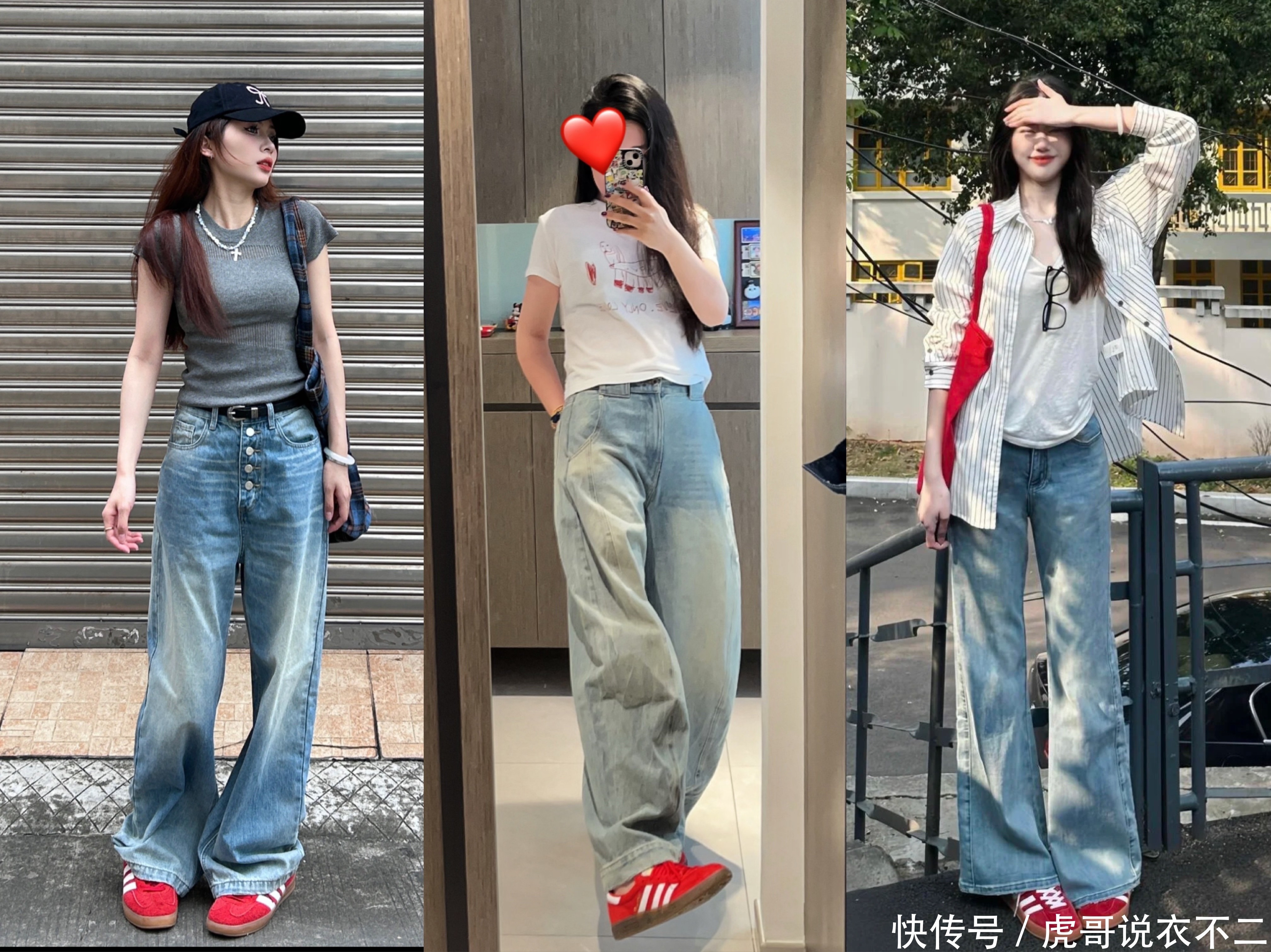 1. 牛仔阔腿裤+德训鞋